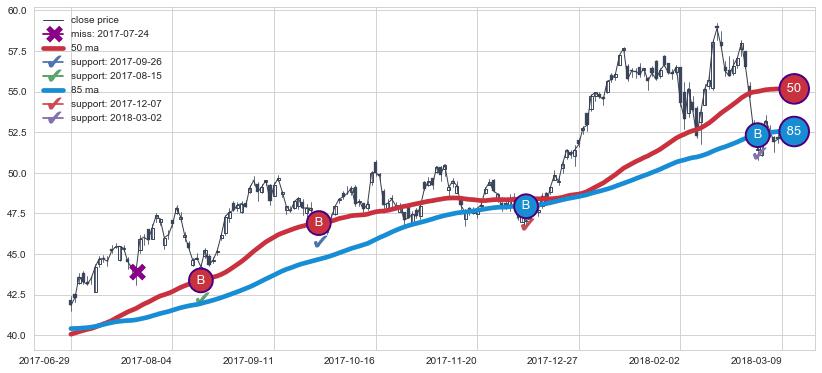 上涨趋势2017-06-29-2018-03-09,均线50, 85确认关键支撑4处