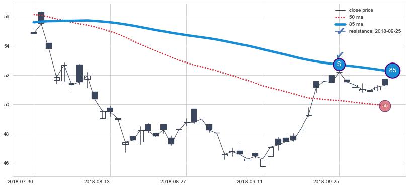 下跌趋势2018-07-30-2018-10-03,均线85确认关键阻力1处