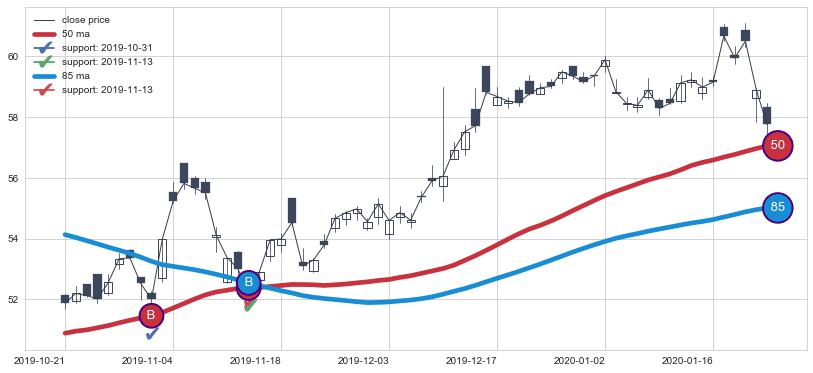 上涨趋势2019-10-21-2020-01-24,均线50, 85确认关键支撑2处