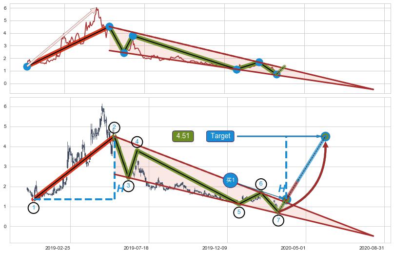 ➣ 【未确认突破,预测即将形成突破】降🚩楔型起点:2018-12-14, 预测突破点:2020-03-27,形态共323交易日
