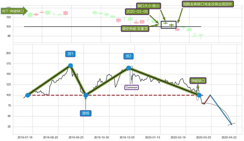 | 5 🅚:绵绵阴跌|下跌不止 ➕ 📐:双重顶下行突破支撑位破位, 猜想持续下沉下跌,被突破的支撑位已变为阻力位 ☞ 看空信号 ⇥ 【🅚线】交织【图形】⇥ 综合量化分数: 45 | > |
