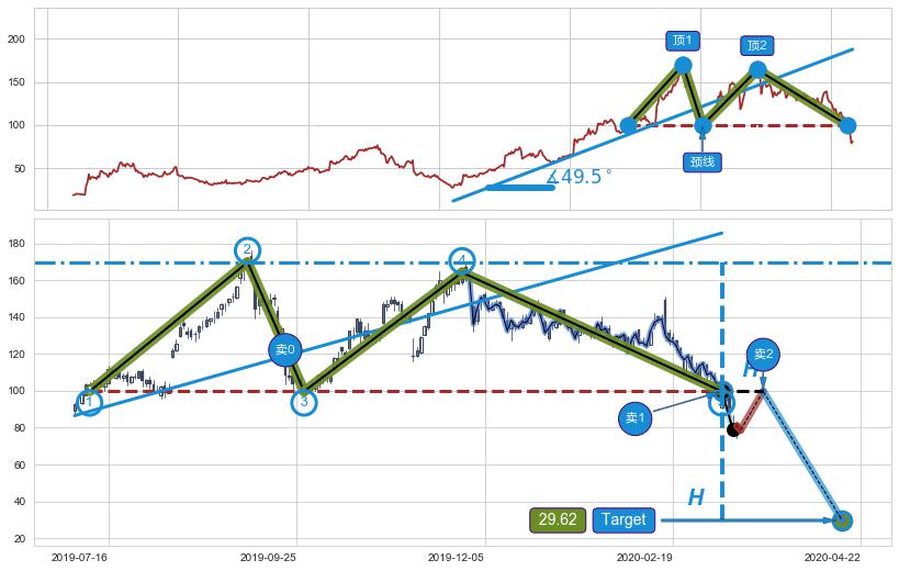 | 4 🅚:【断头铡刀】卖出点 ➕ 📐:双重顶下行突破支撑位破位, 猜想持续下沉下跌,被突破的支撑位已变为阻力位 ☞ 看空信号 ⇥ 【均线】交织【图形】⇥ 综合量化分数: 33 | > |