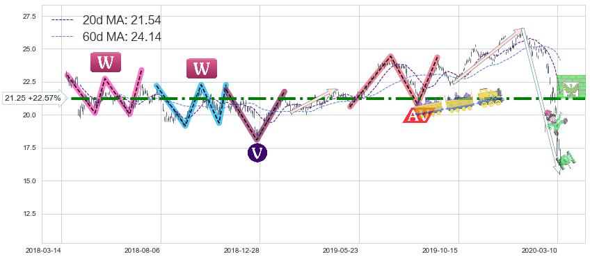 2019-08-16: 第一阻力位21.25有效抑制了下跌浪,成功阻止了价格的继续下跌。