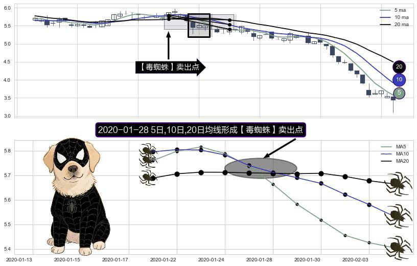 形态多维评估: ⚀ 2020-01-28日显现 5日-10日-20日均线 【毒蜘蛛】卖出点 看空信号,后市看跌,卖出