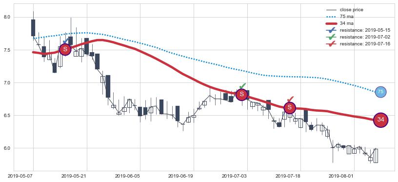 下跌趋势2019-05-07-2019-08-07,均线34确认关键阻力3处