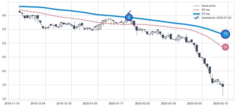 下跌趋势2019-11-19-2020-03-13,均线75确认关键阻力1处