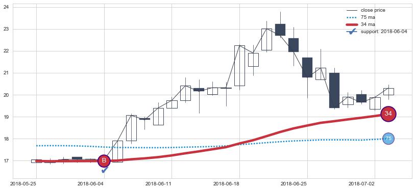 上涨趋势2018-05-25-2018-07-03,均线34确认关键支撑1处