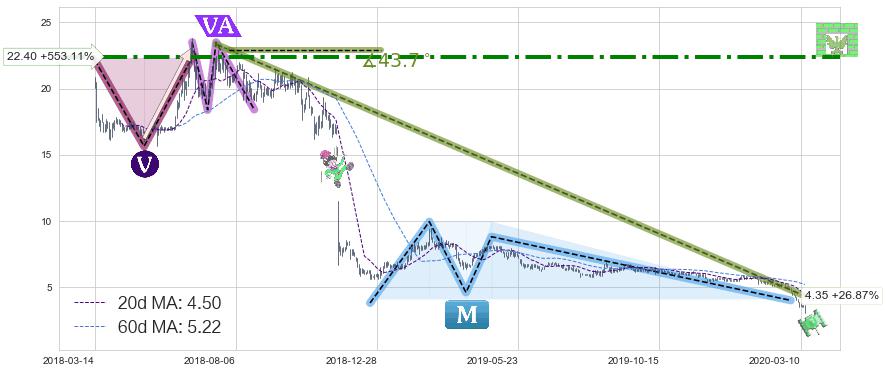 从2018-07-17至2020-03-13,共包含418个交易日,阶段股价下跌-151.77%,阶段股价变动位移路程比: 1 : 5,下跌趋势角度: 43.7,2018-11-15向↘︎形成缺口,跳空下跌-52.97%˚