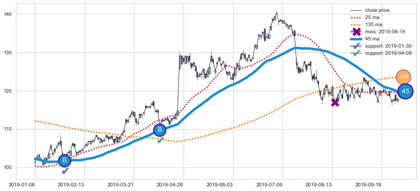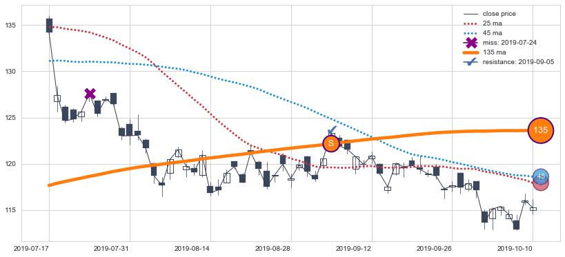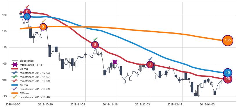 下跌趋势2018-10-05-2019-01-08,均线25, 45, 135确认关键阻力4处