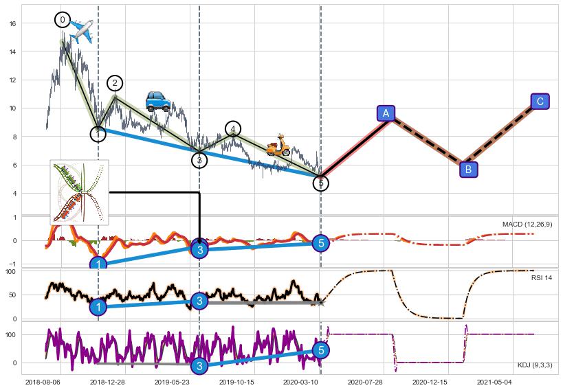 ➢ 1,3,5驱动浪MACD, RSI, KDJ走势都出现【常规背离】反转信号增强