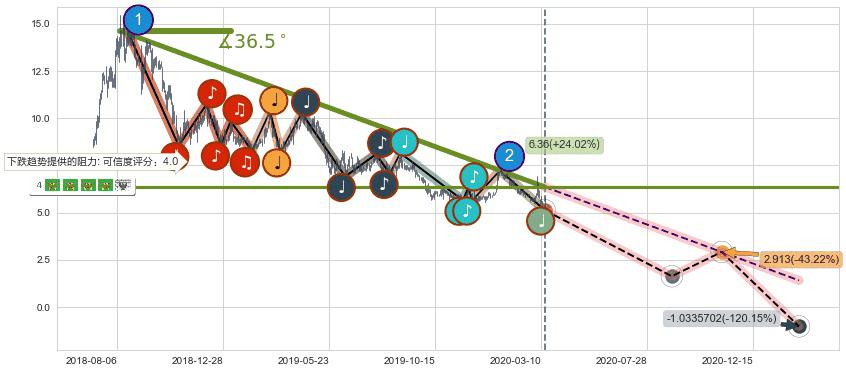 从2018-08-09至2020-03-13,共包含401个交易日,阶段股价下跌-86.52%,阶段股价变动位移路程比: 1 : 10,下跌趋势角度: 36.5