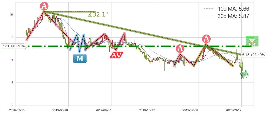 ♘ 阻力价格位7.21,可信任强度99.00%,距离最后交易2020-03-13形成的收盘价格5.13相差 +40.50%