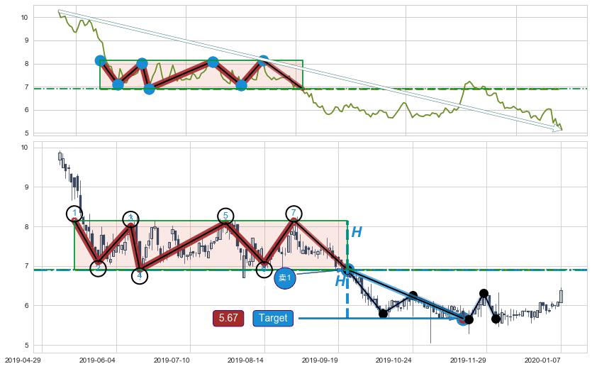 ➢ 【多方力量耗尽】已在2019-09-24突破矩形提供的【支撑】颈线 6.91 →箱形震荡盘整结束
