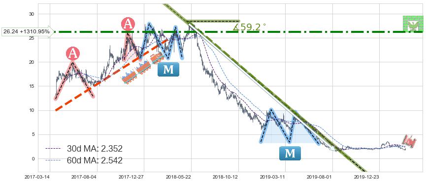 从2018-05-15至2019-09-20,共包含341个交易日,阶段股价下跌-216.72%,阶段股价变动位移路程比: 1 : 5,下跌趋势角度: 54.9