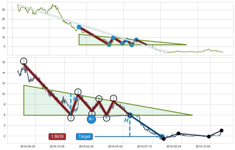 ➢ 【多方力量耗尽,空方打破攻守平衡点】下降三角形中继整理, 已在2019-05-20突破【支撑】颈线 5.95 →演变成下降通道