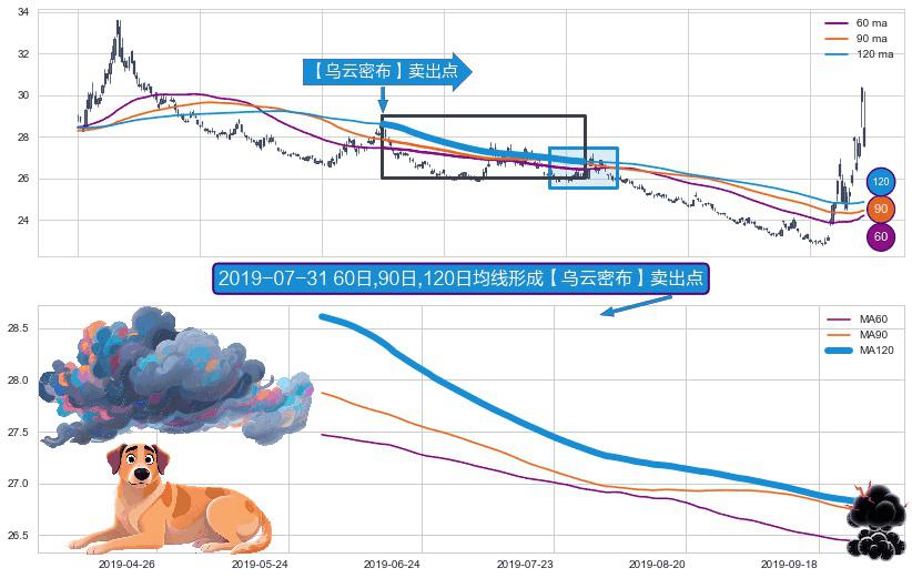 ⚀ 2019-06-03日-2019-09-27日显现 60日-90日-120日均线 【乌云密布】卖出点 看空信号,后市看跌,卖出