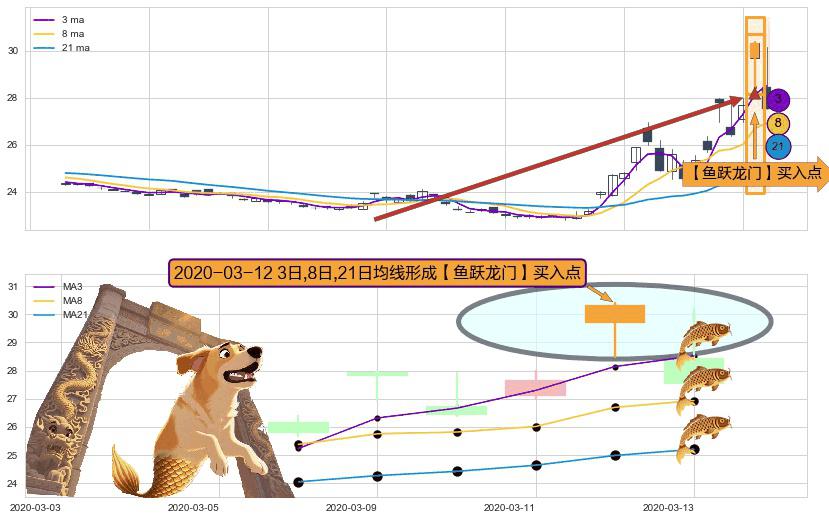 ⚀ 2020-03-12日显现 3日-8日-21日均线 【鱼跃龙门】买入点 看多信号,后市看涨,买入