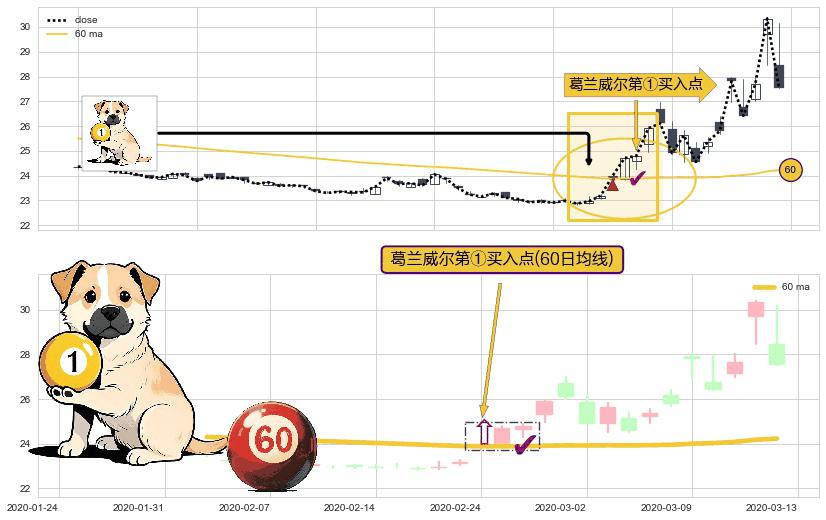 ⚀ 2020-02-24-日显现 葛兰威尔均线 60日均线 第买①入点 走势反转见底信号,后市看涨,买进信号
