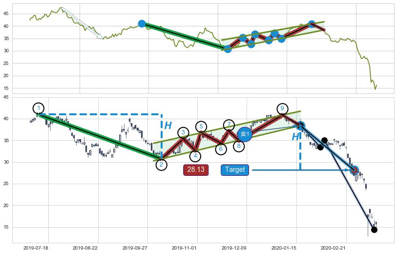 从2019-04-17至2020-03-13,共包含229个交易日,阶段股价下跌-94.49%,阶段股价变动位移路程比: 1 : 4,下跌趋势角度: 13.3,2020-03-09向↘︎形成缺口,跳空下跌-27.42%˚