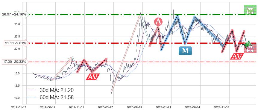 ♘ 支撑价格位21.11,可信任强度73.34%,距离最后交易2022-01-26形成的收盘价格21.72相差 -2.81%