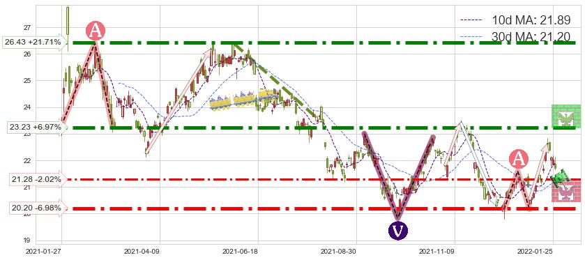 ♘ 支撑价格位20.20,可信任强度95.74%,距离最后交易2022-01-26形成的收盘价格21.72相差 -6.98%