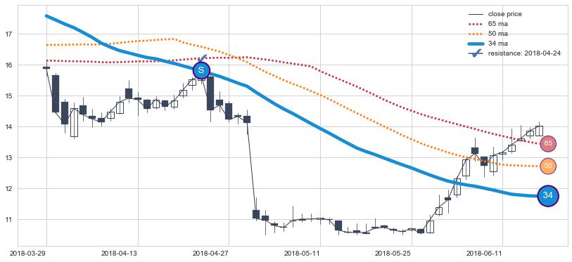 下跌趋势2018-03-29-2018-06-15,均线34确认关键阻力1处