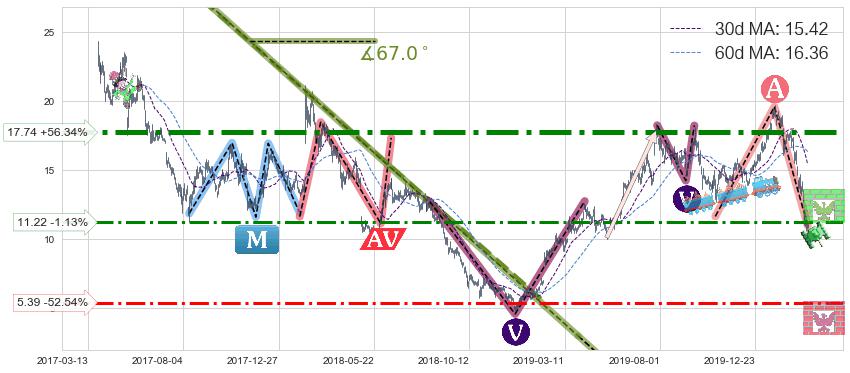 ♘ 阻力价格位17.74,可信任强度88.66%,距离最后交易2020-03-13形成的收盘价格11.35相差 +56.34%
