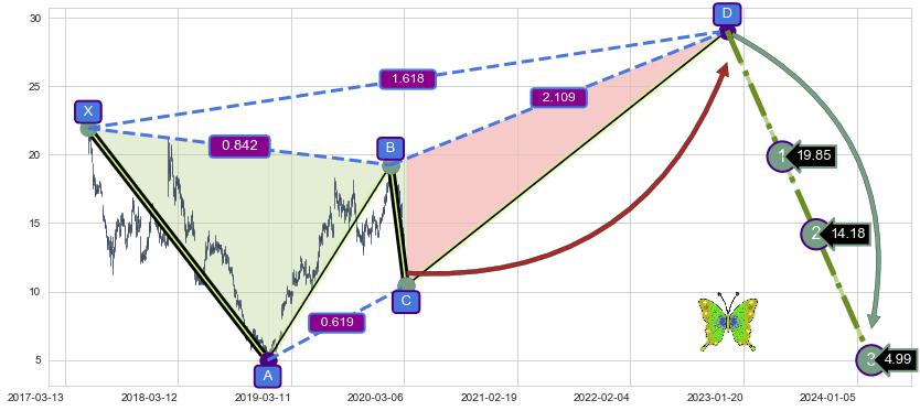 ➣ 未完成【蝴蝶】形态起点X: 2017-05-25, 已到达C点: 2020-03-12, 预测最终D点: 2022-12-01, 共1414交易日
