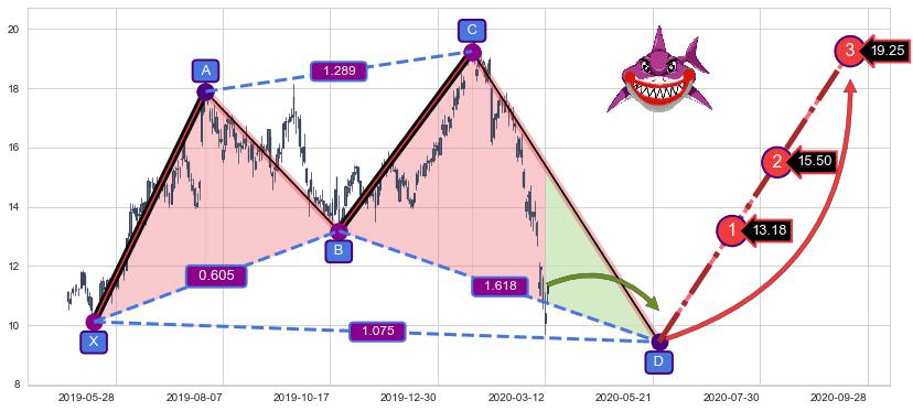➣ 未完成【鲨鱼】形态起点X: 2019-05-13, 已到达C点: 2020-01-23, 预测最终D点: 2020-05-26, 共263交易日