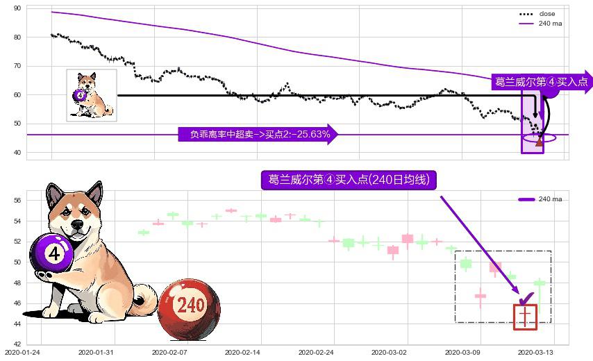 形态多维评估: ⚀ 2020-03-12-日显现 葛兰威尔均线 240日均线 第④买入点 下降趋势均值回复的短线反弹信号,后市看涨,买进信号