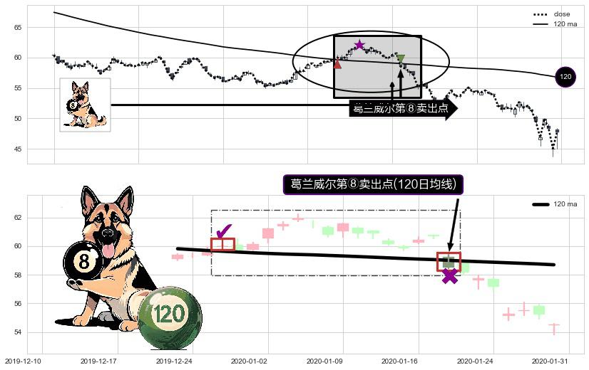形态多维评估: ⚀ 2020-01-21-日显现 葛兰威尔均线 120日均线 第⑧卖出点 下降趋势的中继信号,后市看跌,卖出信号