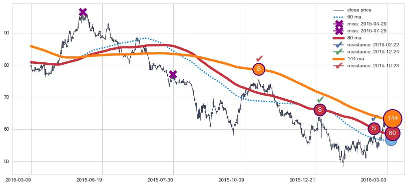 下跌趋势2015-03-09-2016-03-03,均线80, 144确认关键阻力3处