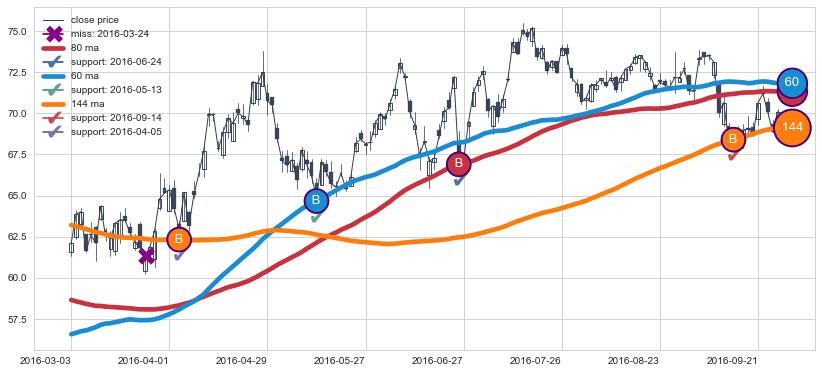 上涨趋势2016-03-03-2016-09-27,均线80, 60, 144确认关键支撑4处