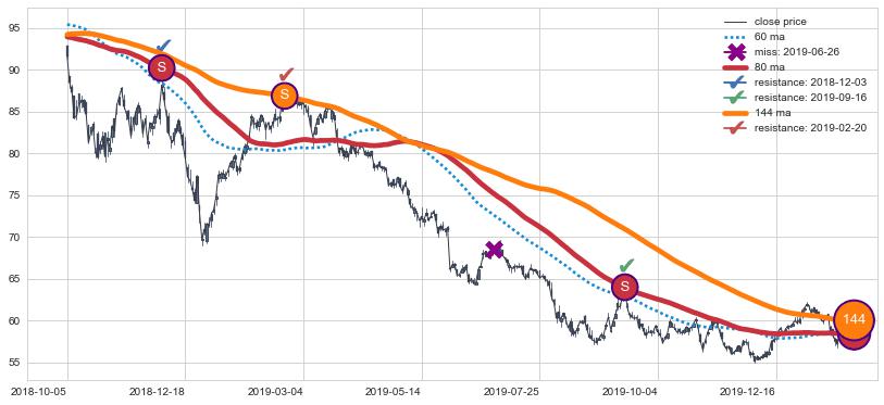 下跌趋势2018-10-05-2020-01-24,均线80, 144确认关键阻力3处