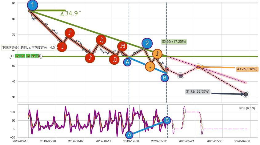 从2019-03-18至2020-03-13,共包含251个交易日,阶段股价下跌-55.17%,阶段股价变动位移路程比: 1 : 5,下跌趋势角度: 34.9