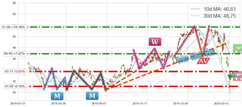 ➣ 【已确认突破】最后价格:43.72与最小【反转】第一目标价格→(2020-04-15: 37.98 )相较: 下跌空间【中等】
