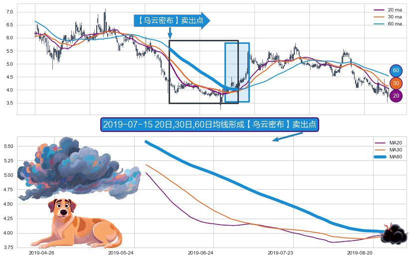⚀ 2019-05-30日-2019-08-26日显现 20日-30日-60日均线 【乌云密布】卖出点 看空信号,后市看跌,卖出