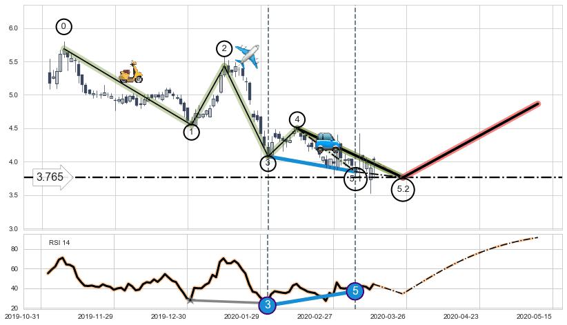 ➣ 5.1: 预测当前第5浪位置(2020-03-06, 3.850),仍然有下跌空间