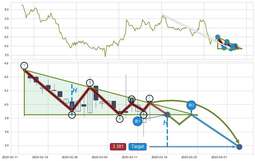 ➣ 【未确认突破,预测即将形成突破】下降三角形整理起点:2020-02-12, 预测突破点:2020-03-18,形态共25交易日