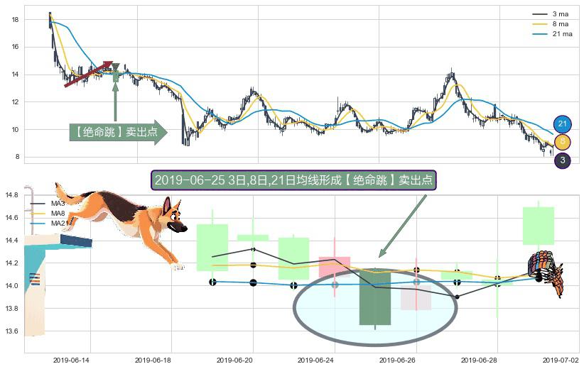 形态多维评估: ⚀ 2019-06-25日显现 3日-8日-21日均线 【绝命跳】卖出点 看空信号,后市看跌,卖出
