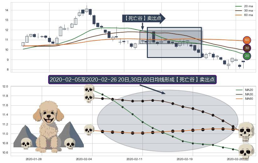 ⚂ 【死亡谷】卖出点 由MA20均线下穿MA30均线和MA60均线,MA30均线下穿MA60均线形成
