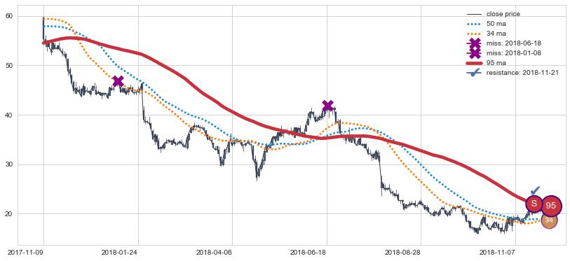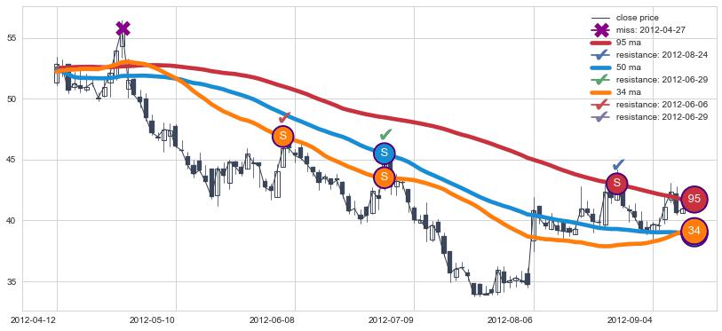 下跌趋势2012-04-12-2012-09-11,均线50, 34, 95确认关键阻力3处