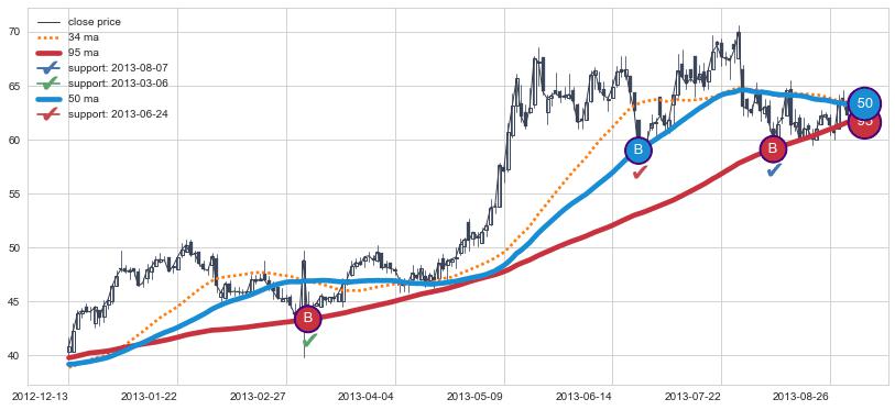 上涨趋势2012-12-13-2013-08-30,均线50, 95确认关键支撑3处