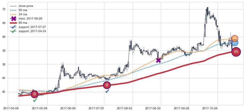 上涨趋势2017-04-06-2017-11-09,均线95确认关键支撑2处