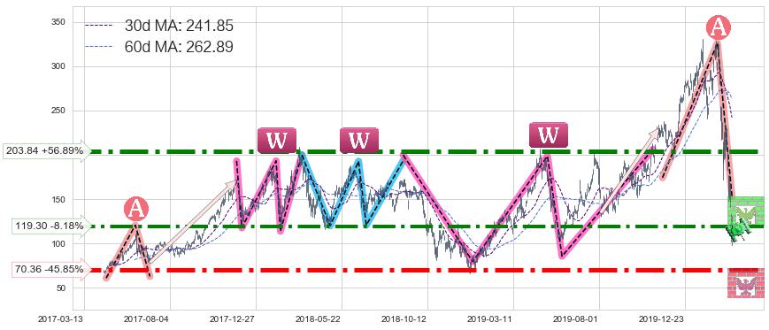 ♘ 支撑价格位70.36,可信任强度94.82%,距离最后交易2020-03-13形成的收盘价格129.92相差 -45.85%