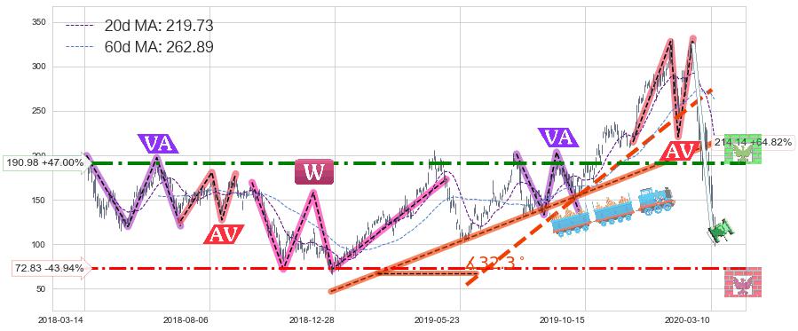 ➣ 2018-12-24-2020-03-11上升趋势存在反转[风险],其原上升趋势的支撑位(214.14)已破位[强阻力信号],原上升趋势角度: 32.3˚