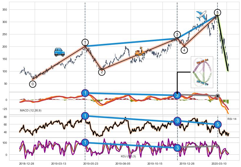 ➣ 1,3,5驱动浪MACD, RSI, KDJ走势都出现【常规背离】反转信号增强
