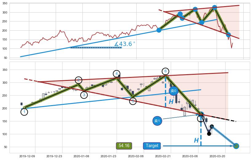 | 2 🅚:上探下跌 ➕ 📐:扩散三角反转下行突破支撑位破位, 猜想持续下沉下跌,被突破的支撑位已变为阻力位 ☞ 看空信号 ⇥ 【🅚线】交织【图形】⇥ 综合量化分数: 48 | > |