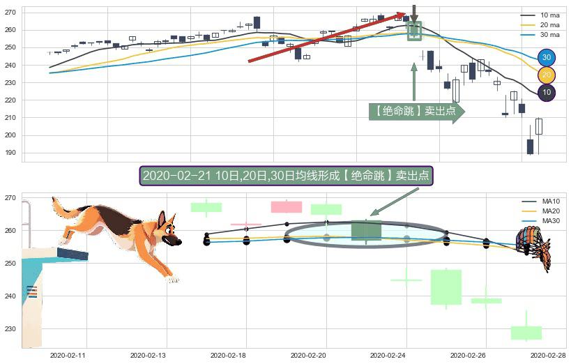 ⚀ 2020-02-21日显现 10日-20日-30日均线 【绝命跳】卖出点 看空信号,后市看跌,卖出