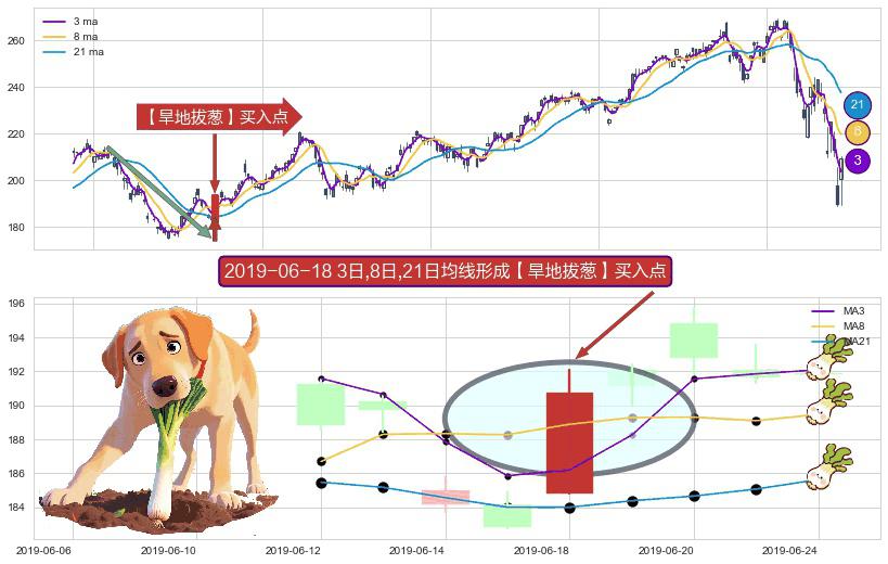 ⚀ 2019-06-18日显现 3日-8日-21日均线 【旱地拔葱】买入点 看多信号,后市看涨,买入